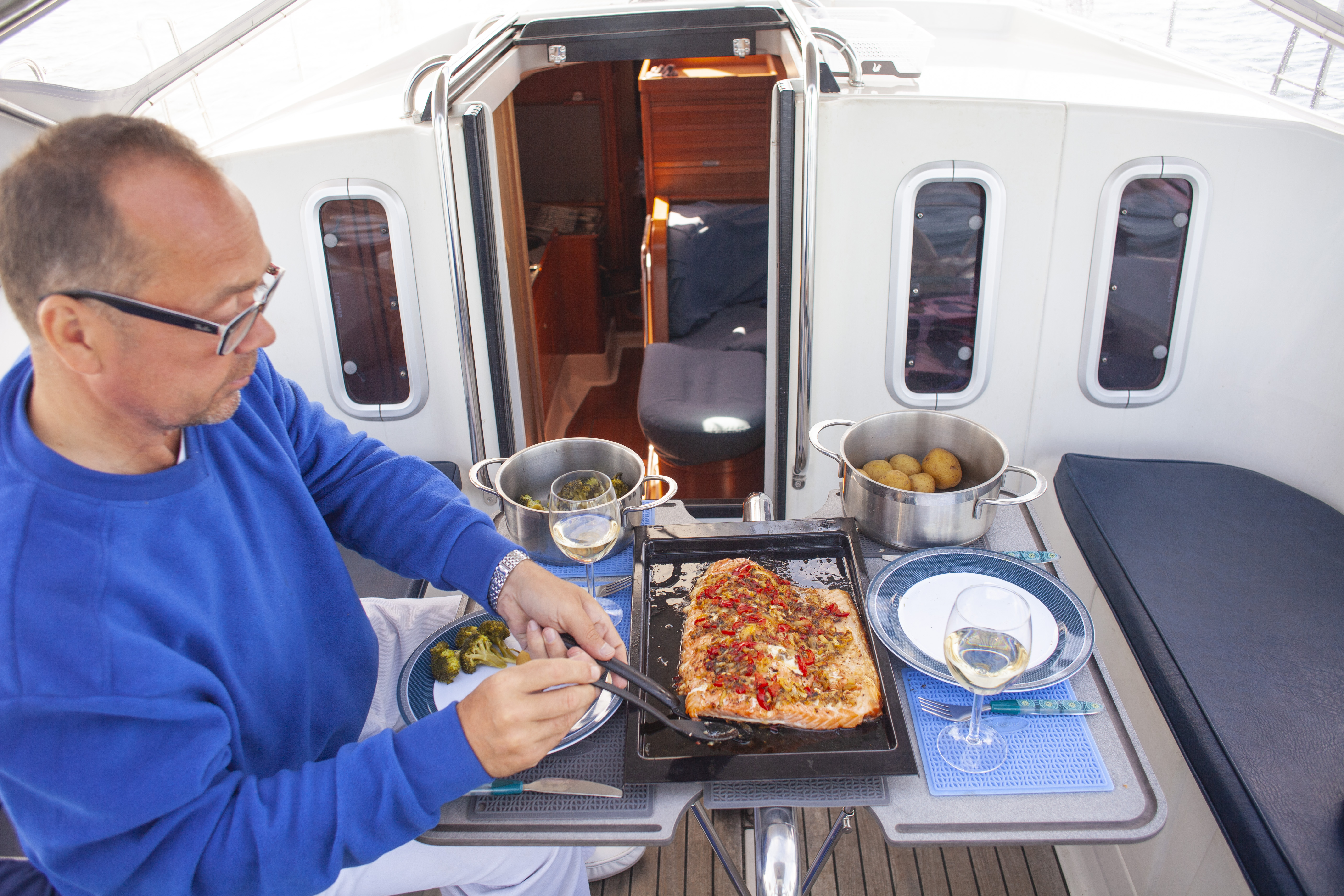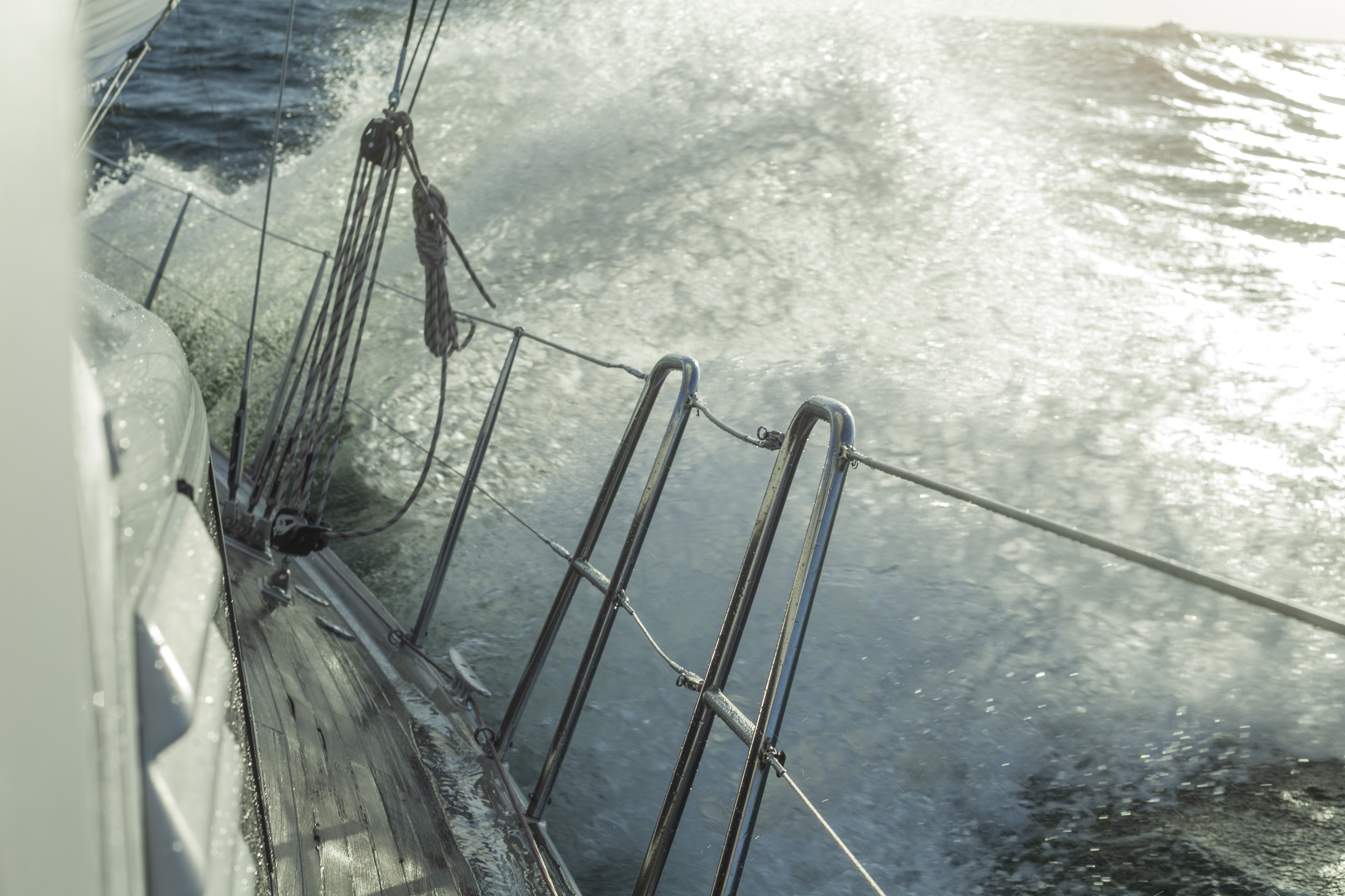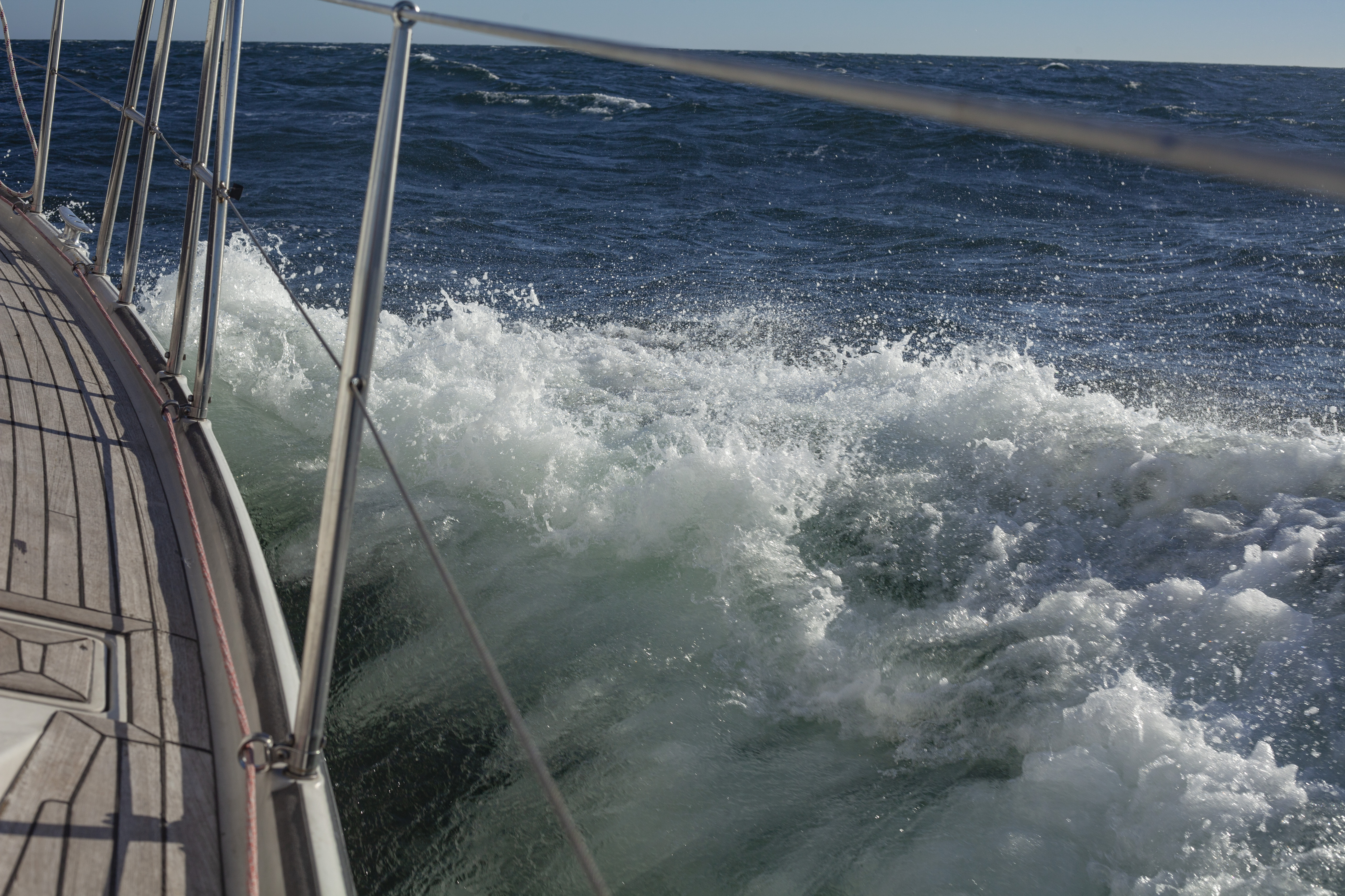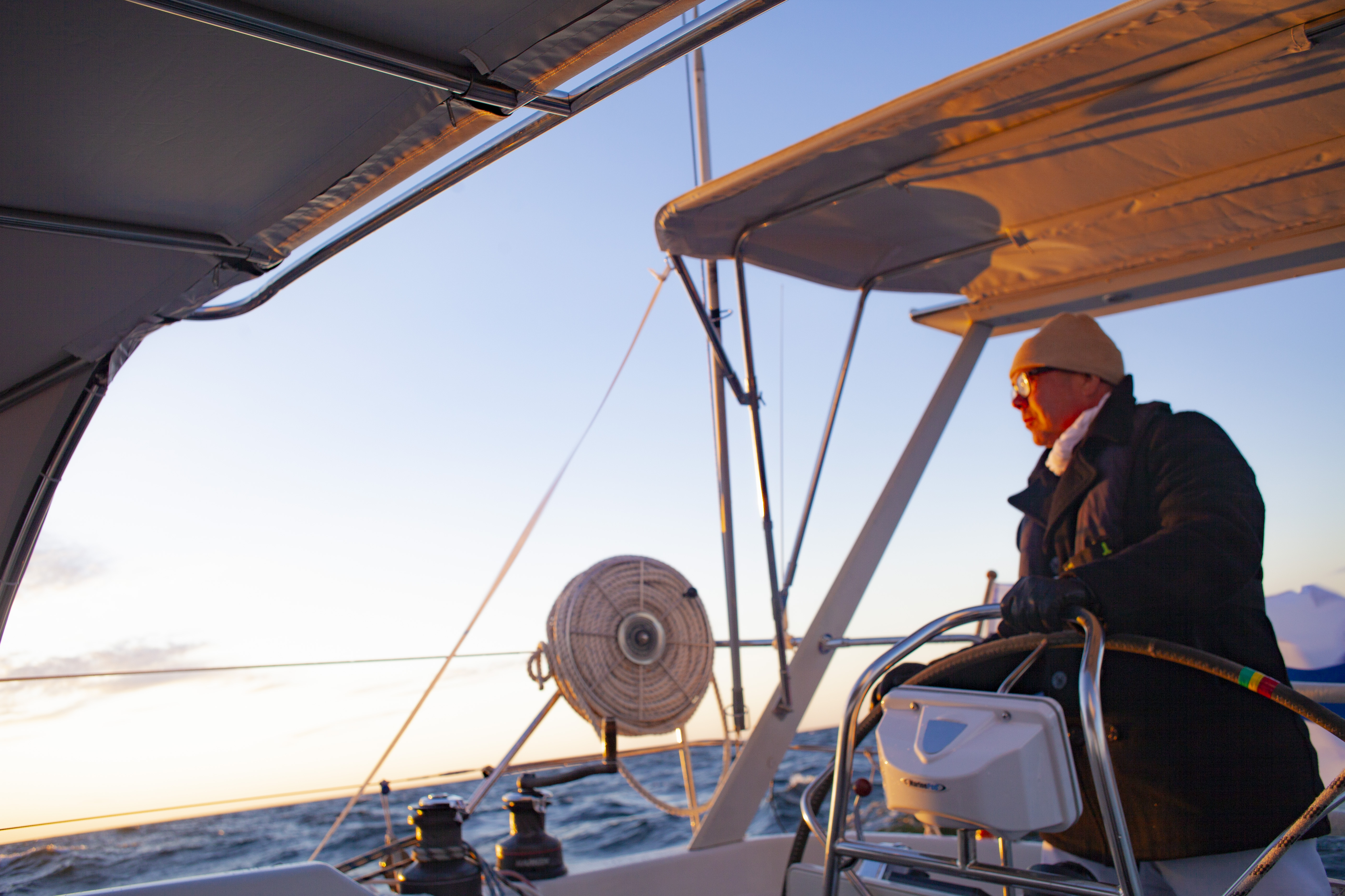 Seuraavana aamuna kierähdin hytissäni, ja nousin silmiä hieroen kannelle vetämään Jaakon kanssa kakkosreiviä kireälle 13 metrin puuskissa. Tuuli vei nyt matalaa. Ei aikaakaan, kun veto hiipuu jälleen pariin metriin, ja tyyni jätti mainingit purjeita paiskomaan. Moottori piti käynnistää. Tunnin kuluttua pilvetön taivas aukeni, ja se toi kolmen metrin avotuulen nautiskelijoille. Kaikki tämä tapahtui yhden vuorokauden kierrossa.