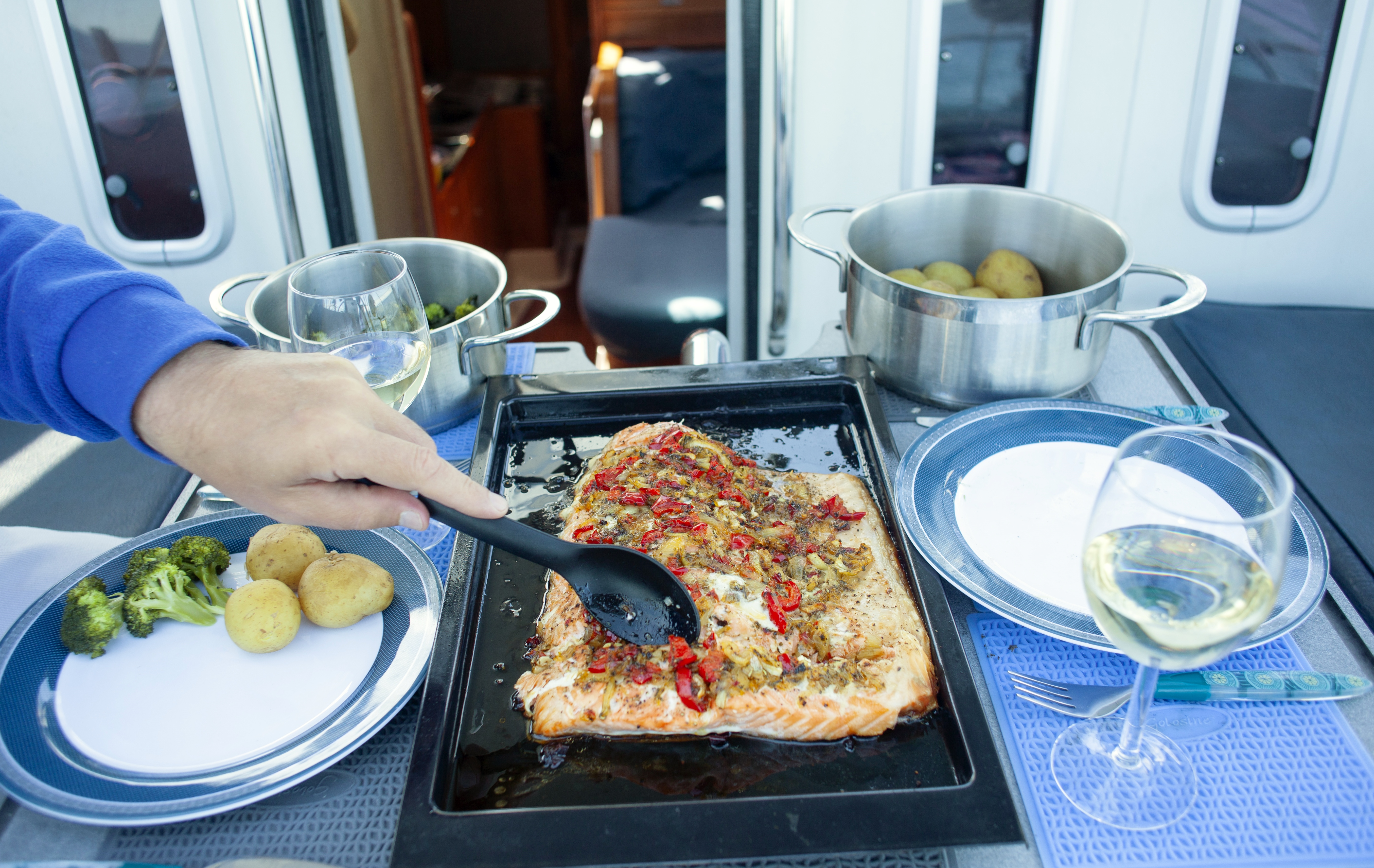 Autopilotti piti Astrean kurssin asteen, pari tarkkuudella koko yön. Olemme yleensä ruorissa vain ajaessamme satamasta ulos ja sisään. Tuuli hyytyi aamuyön tunteina. Oli taas joko lilluttava tuulta odottaen tai käynnistettävä Yanmar. Valitsimme edellisen. Lilluminen on hyvää siedätyshoitoa kenelle tahansa. Pysähdys keskellä merta haastaa kiireiseen informaatiotulvaan tottuneen miettimään pelkkää olemista. Ei VHF-puhelinta kummempaa yhteyttä maihin. Puuhastelimme kaikenlaista. Muun muassa valmistin uunilohta keskisen Itämeren kunniaksi. Alkuillasta odotettu pohjoistuuli täytti purjeet, ja yön leikkasimme neljän viiden mailin tuntivauhdilla kohti etelää.