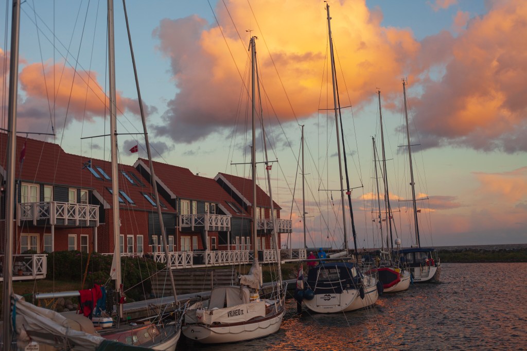 Vaihdoimme uuden plokin, ja päätimme jäädä vielä toiseksi yöksi Ystadiin, koska tuuli ei osoittanut moinaamisen merkkejä. Nostimme purjeet illan hämärtyessä, vaikka vastatuulta oli vielä riittämiin. Yöllä se nousi jälleen 11-14 metrin lukemiin. Päivän koittaessa päätimme vetäytyä pitelemään tuulta ankkuriin Tanskan Klintholmiin, ”rantakallion” suojaan. Ja illalla ajoimme niemen toiselle puolelle Klintholmin satamaan. Päivien veneessä istumisen jälkeen oli ilo polkea Klintholmin komeimmalle näköalapaikalle ja käydä geopantologisessa museossa.