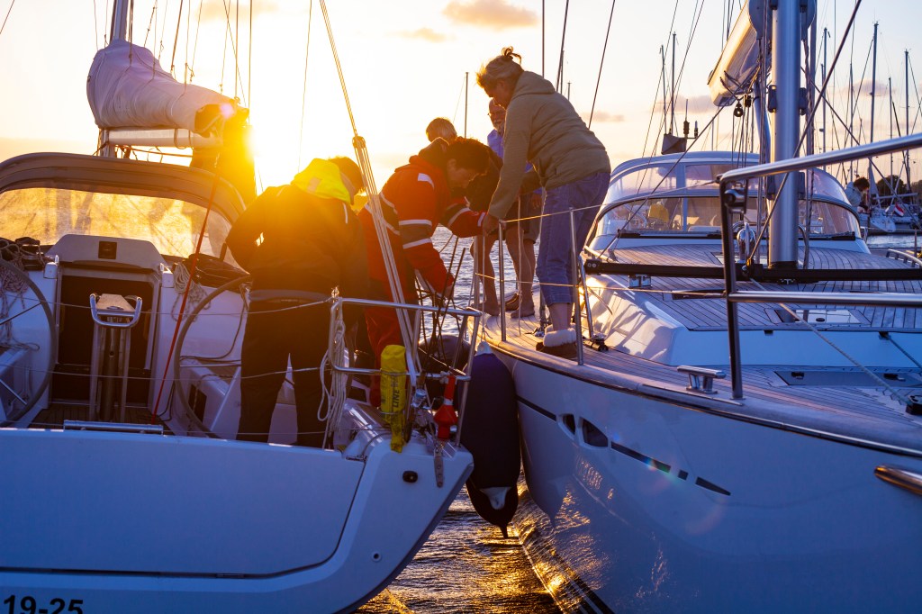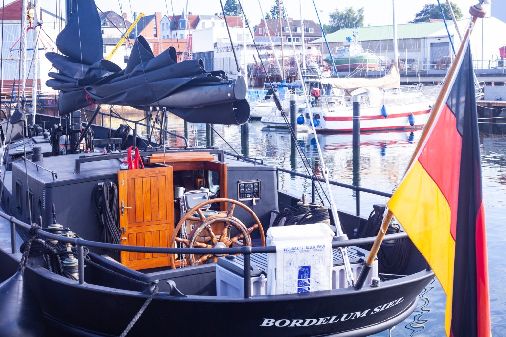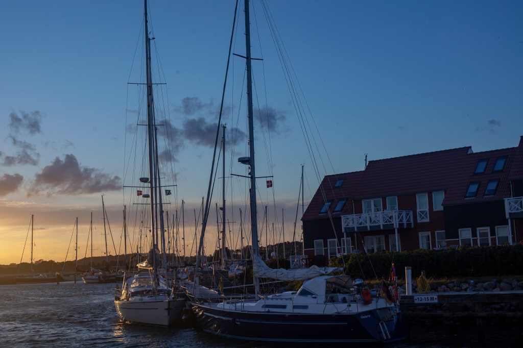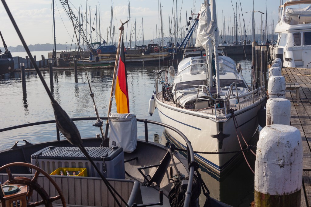 Seuraavan levähdyspaikan jätimme avoimeksi, koska vastainen tuuli ja saderintama tuottavat aina yllätyksiä. Päätimme jatkaa yön yli Kieliin tai poiketa jossain, jos säätila niin vaati. Luovikulma heikkeni kakkosreivillä 30 asteesta käytännössä 45 asteeseen, mikä puolestaan vaikutti matkan pituuteen. Aikaa kului, ja päätimme yöllä mennä Grossenbrodenin lahteen ankkuriin Saksassa. Jo lahteen ajo aamukolmelta pimeässä oli pujotteluhaaste itsessään, varsinkaan kun sisäänajon omia viittoja ei näkynyt plotterissa. Lahteen oli merkitty ankkurointialue. Kiersimme hitaasti ankkurointialueella, kun huomasimme että olemme verkkolippujen saartama. Suuri osa lahdesta oli miinoitettu kalaverkoilla. Äkkiä kuokka ylös ja etsimään uutta paikkaa.