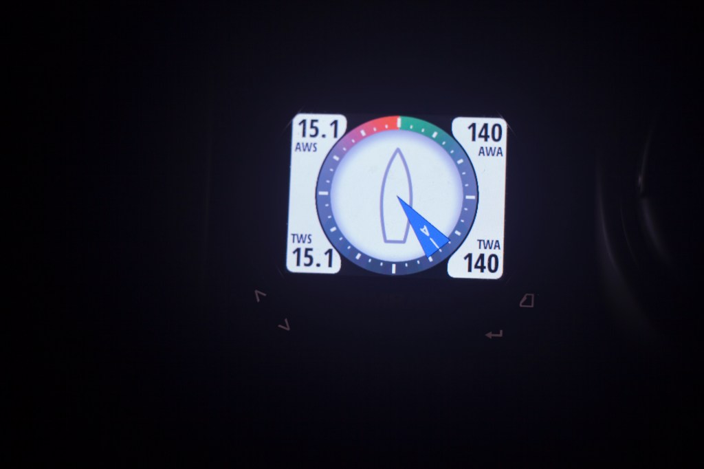 Illan mittaan tuuli voimistui vastaiseksi, ja luovit veivät Naissaareen länsipuolelle. Tuuli vaihteli saapuvan matalapaineen saattelemana. Asensimme vakiopurjetta ja ykkösreiviä vuoron perään sitä mukaa, kun sopivalta tuntui. Suden hetkinä näkyvyys sumeni rokkasumuun. Silmämme tavoittelivat vain AISin ja tutkan ruutuja, muita havaintoja oli horisontissa turva tavoittaa.