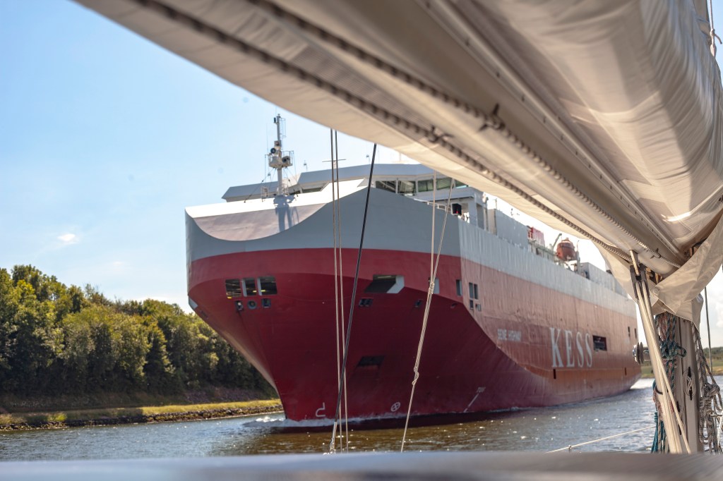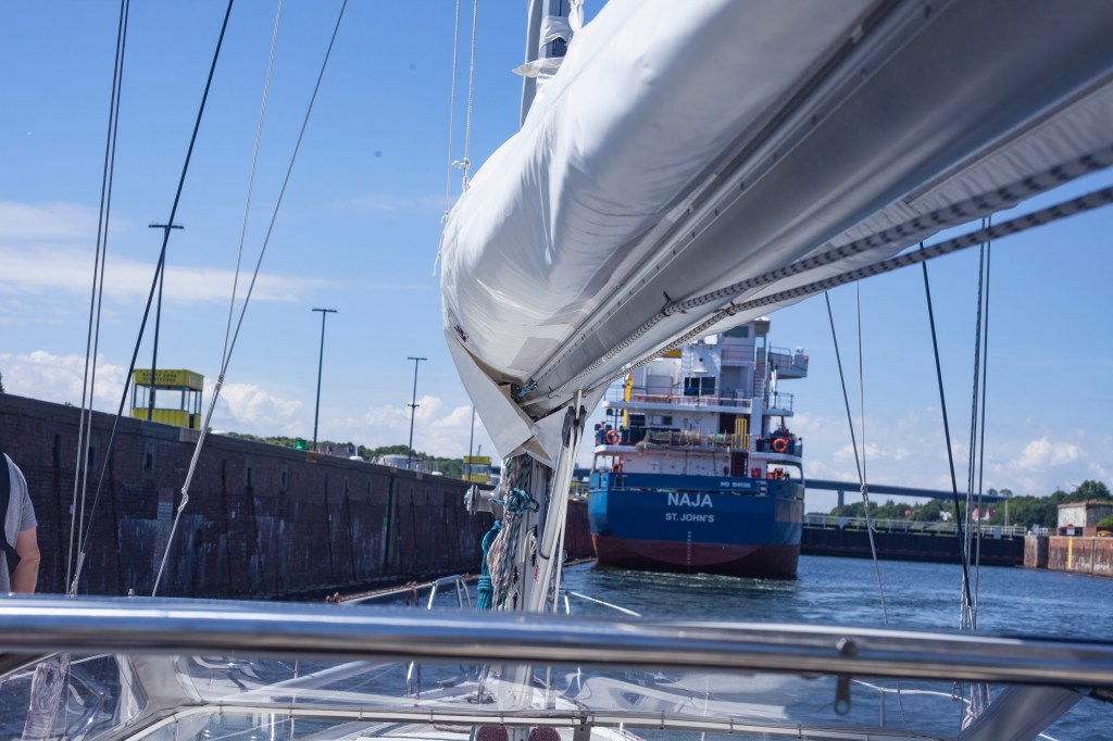 Puolen päivän aikaan sulutuksessa ei ollut meidän lisäksi muita veneitä. Odottelimme aikamme, kun yli 50 metrin rahtilaiva ajoi sisään. Okei, sovelsimme kolmatta ohjetta seuraten laivan 20 metristä peräpeiliä. Sulkuvahti otti meihin kuitenkin yhteyttä ensin saksaksi ja toisti asian englanniksi: ”Sailing boat, turn around and go back”. Käänsin pyörteissä välittömästi tulosuuntaa ja lähdimme ajamaan ulos. Muutaman veneen mitan jälkeen sulkuvahti antoi uuden ohjeen: ”Sailing boat, now, you are alout to run in, but at your own risk”. Nämä ohjeet tulevat solkenaan puheenparsien sarjoissa. Rannalla ei kuitenkaan kukaan kertonut, että laivan kanssa samaan sulutukseen ei tule ajaa ennen kuin laiva on kiinnitetty ja sulkuvahti antaa siihen luvan. Tämä siis epävirallisen täydennyksenä ohjeisiin. Jälkeenpäin löytämäni viralliset ohjeet ovat osoitteessa: http://www.wsa-kiel.wsv.de/Service/Publikationen/Anlagen/engl_Merkbl_Sportbootfahrer.pdf.