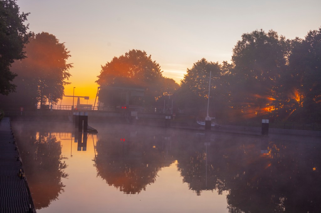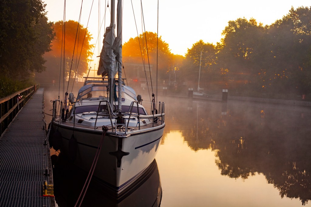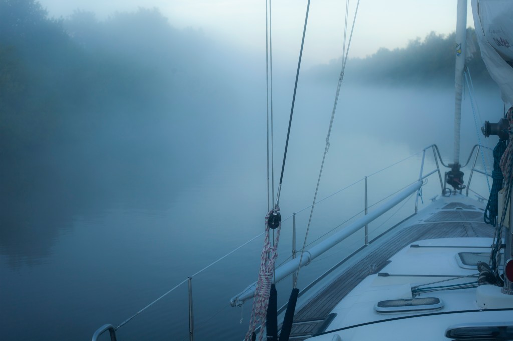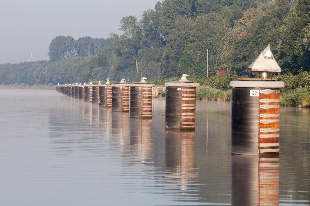 Sulun ajamiseen menee purjeveneellä noin 8-9 tuntia. Koska olimme matkalla vasta iltapäivällä, meidän tuli etsiä kanavassa yöpymispaikka. Kanavassa on vain tietyt pysähtymispaikat. Laskimme, että voimme yöpyä sivukanavassa parikymmentä mailia Brunsbuttelista, jossa pienveneille pysähtymissatama kylkikiinnityksellä. Auringonsäteet välkehtivät pumpulisessa aamusumussa, kun livuimme kanavaan ja linnut pitivät konserttiaan.