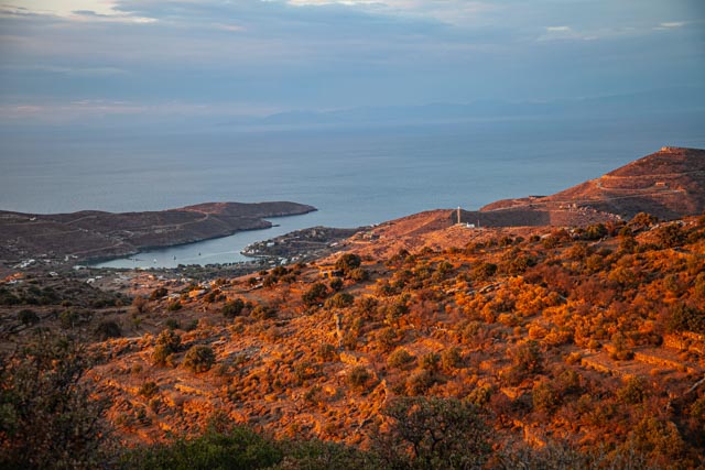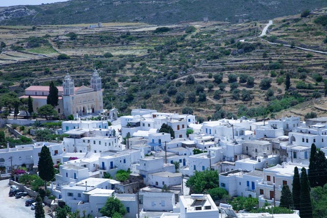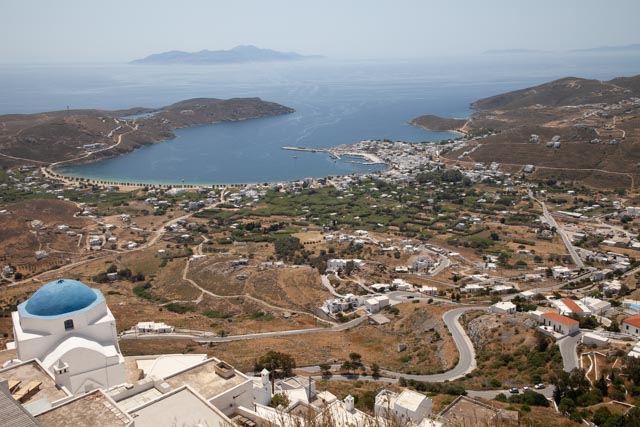 Viimeistään silloin, kun nouset Piazzalle, et voi olla ihastelematta näkymiä Avlomonasin lahdelle. Näköala avautuu etelään, ja rannikon kaarevat muodot, sininen meri ja kauempana erottuvat saaret muodostavat postikorttimaiseman. Choran laelta näet myös viljellyt laaksot ja polveutuvat vuorimaisemat (kuvassa Ano Chora).