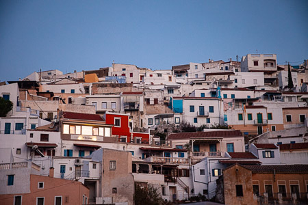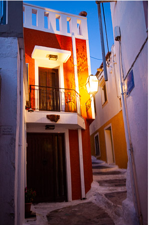 Kuva: Ioulida, kuten useat muutkin Egean kaupungit, on rakennettu ylös korkeiden mäkien rinteille. Talot on rakennettu vieri viereen maastoa myötäillen. Kapeat kujat johtavat harvoille ulosmenoteille. Valkoiset talot ovat kuin sokeritoppia toistensa lomassa. Ja kujat nousevat ja laskevat kivisinä askelmina labyrintissä. Vuosisatojen saatossa asukkaiden perustarpeet ovat movanneet arkkitehtuuria. Naapurien läheisyys on tuonut turvaa niin merirosvojen hyökkäyksissä kuin myös läheisyys on pitänyt yllä sosiaalista yhdessäoloa ja tarjonnut tukea arkielämän monissa ongelmissa. Lisäksi vuoren tai mäen rinteellä ilman lämpötila on muutaman asteen viileämpää. Samoin lähekkäin rakennetut talot varjostavat toisiaan iltapäivän kuumuudessa.