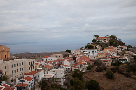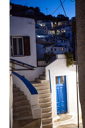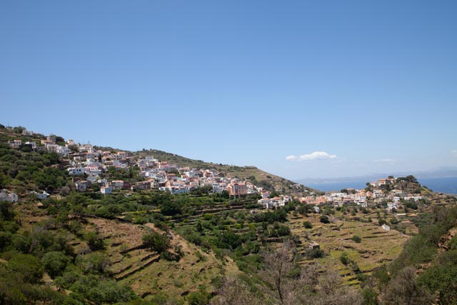 Kuva: Ioulidan ”pääkaupunki” sijaitsee marinasta kolmisen kilometriä vuorenrinteessä. Kaupungissa ei ole montaa tasannetta, jossa voisi astella tasamalla. Pikemminkin olet menossa jatkuvasti ylös tai alas.