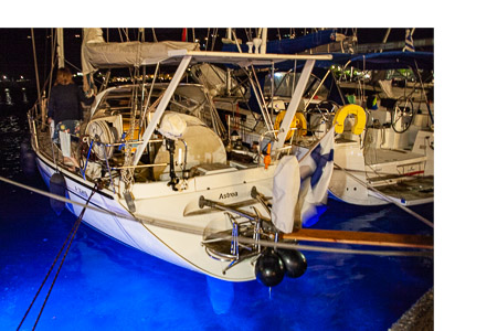 Hurjaa keinumista jatkui koko yön. Rivistön kaksi 50-jalkaista charter-venettä murjoi peräpeilinsä kivilaituriin, ja viisi venettä pakeni yöllä toiseen lahteen ankkuriin. Me irrottauduimme aamuyöllä laiturista ja jäimme kahden ankkurin varaan laiturin ulkopuolle odottamaan tuulen tyyntymistä. Yksi purjevene kärsi konerikosta, ja vene jäi kivilaituriin. Konerikko ja veneen kyljen murjominen veivät mehut miehistöltä heti kauden alussa. Astrean haveri rajoittui uimatikkaiden vääntymiseen, jonka katamaraani aiheutti peräköyden kiristyessä. Siirryimme aamulla ankkuriin toiseen lahteen unettoman yön jälkeen.