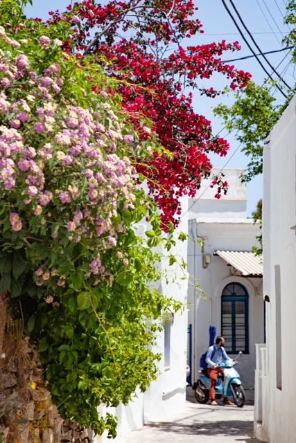 Kuva: Värikkäät istutukset koristavat valkoiseksi maalattuja taloja ja kivettyjä kujia.