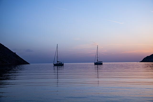 Kuva: Auringonlaskun lumoa Kamares-lahdella. Lahti tarjoaa suojaa Meltemi-tuulilta. Sen sijaan eteläiset tuulet jättävät lahden tyhjäksi ankkuroituvista veneistä.
