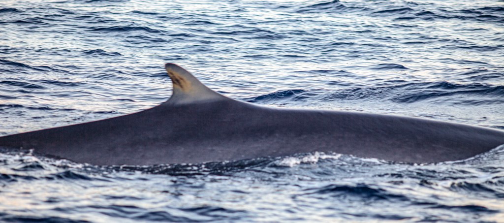 Valaiden kuvaaminen keinuvassa veneessä ja iltahämärissä on minulle haasteellista. En voi tarkkaan ennakoida valaan nousua pintaan. Kameran kohdistaminen käsisäädöllä vaatii nopeutta ja pystyssä pysymistä. Ja siinä samassa, kun painan suljinta, valas on jo aloittanut sukelluksensa. Vasta jälkeenpäin voin nähdä, sainko riittävän tarkan kuvan. Siksi myös oheiset, osin epätarkat ruudut kertovat, kuinka vaikeaa on valaiden kuvaaminen noissa olosuhteissa.
