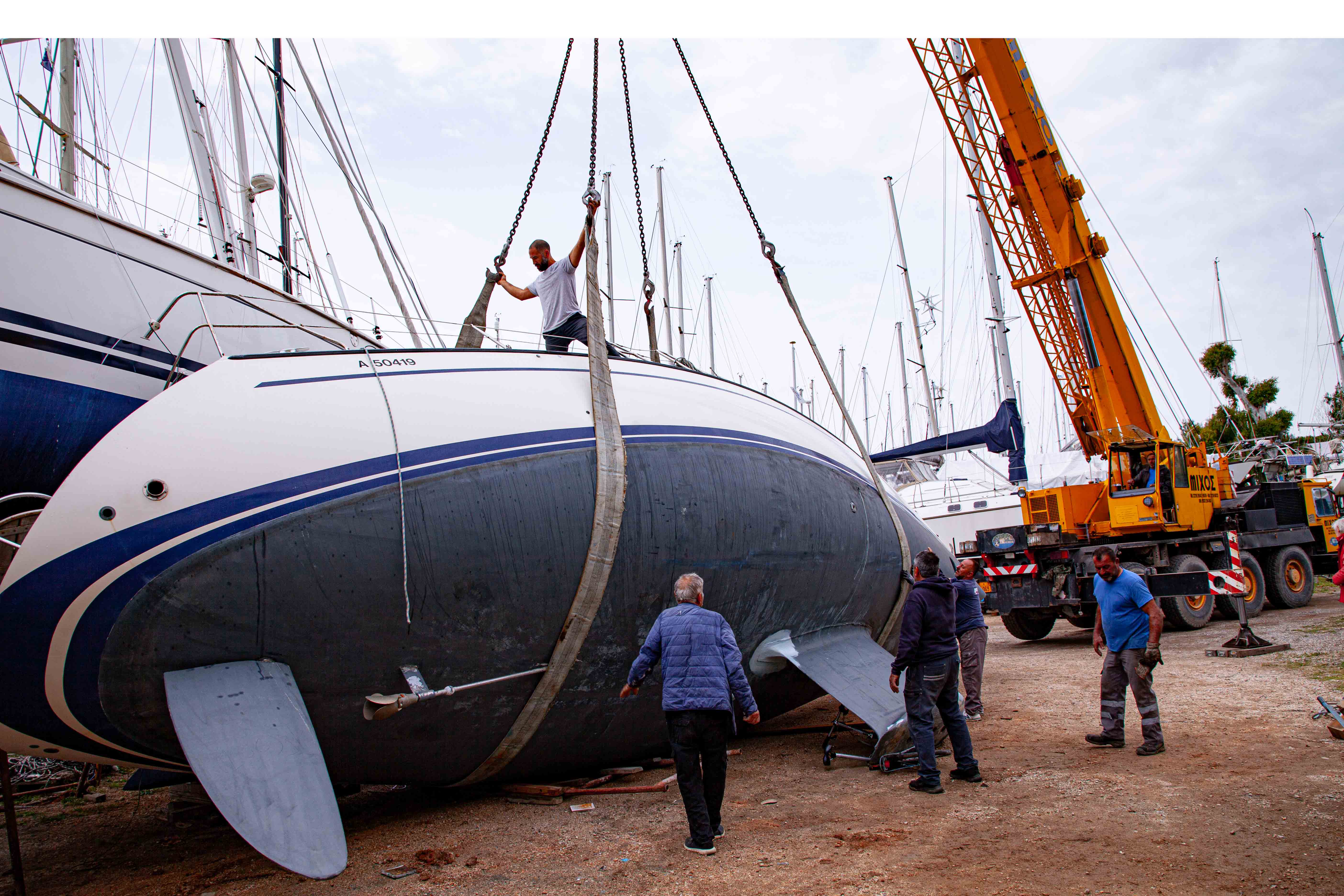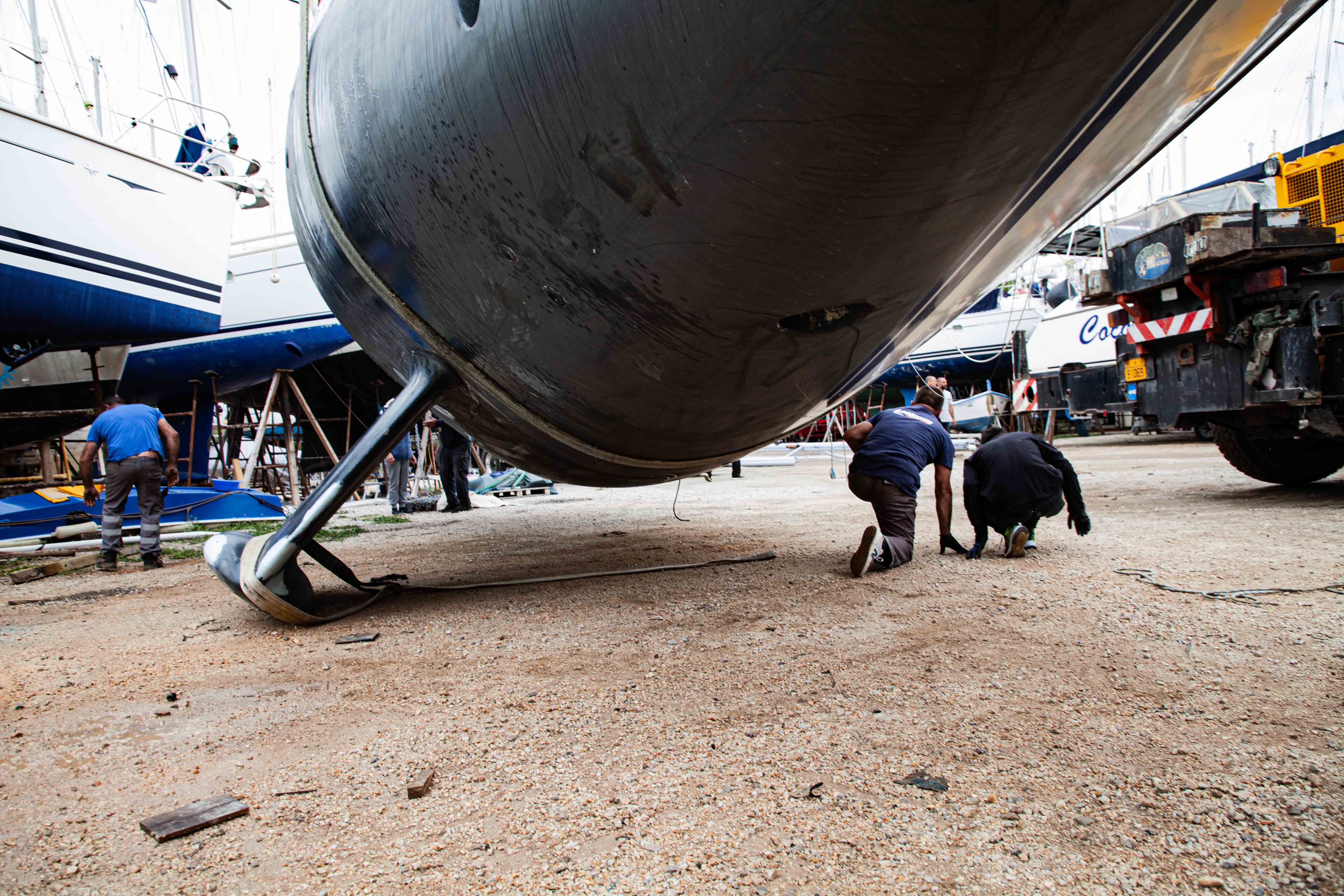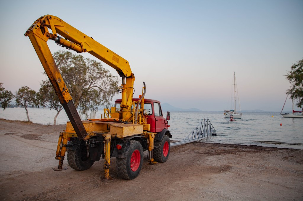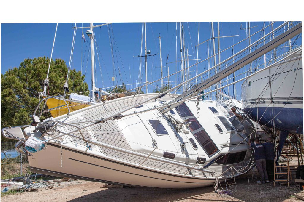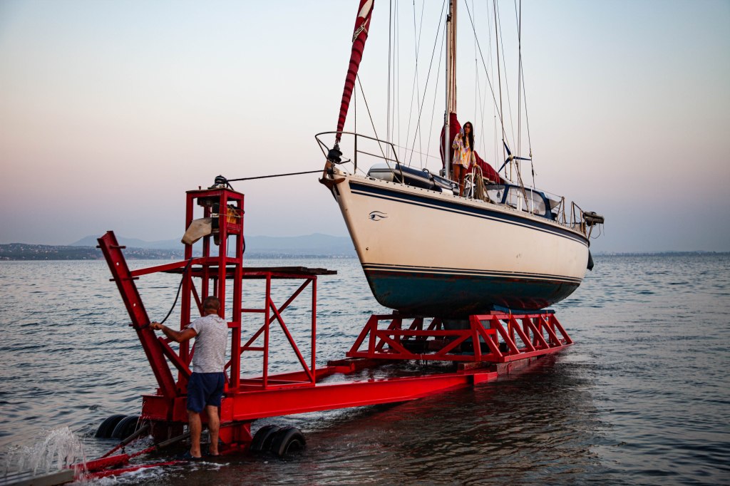 Petros vetää purren kuiville ja työntää sen jeepillä varattuun paikkaan. Istut veneessäsi sillä aikaa, kun telakoitsijat asettavat pukit alle. Hydraalipaineet laskevat, pari nytkähdystä, ja olet valmis astumaan marinan kamaralle.