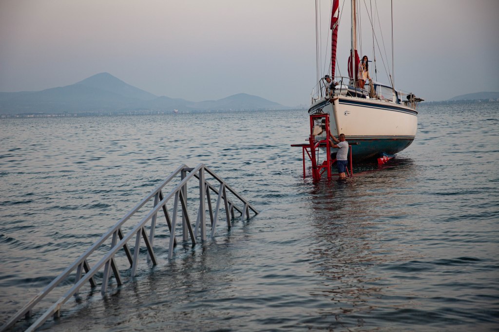 Astrean ajo trailerille. Telakka on hiekkarannalla. Saat ystävällisen neuvon kiinnittyä edellisenä iltana poijuun. Ensikertalaiselle, kuten minulle näkymättömälle trailerille ajo askarruttaa. Näet vain jonkin telineen vedessä ja sen päällä viittoilevan telakan työntekijän. Tyynellä säällä kaikki menee hyvin.