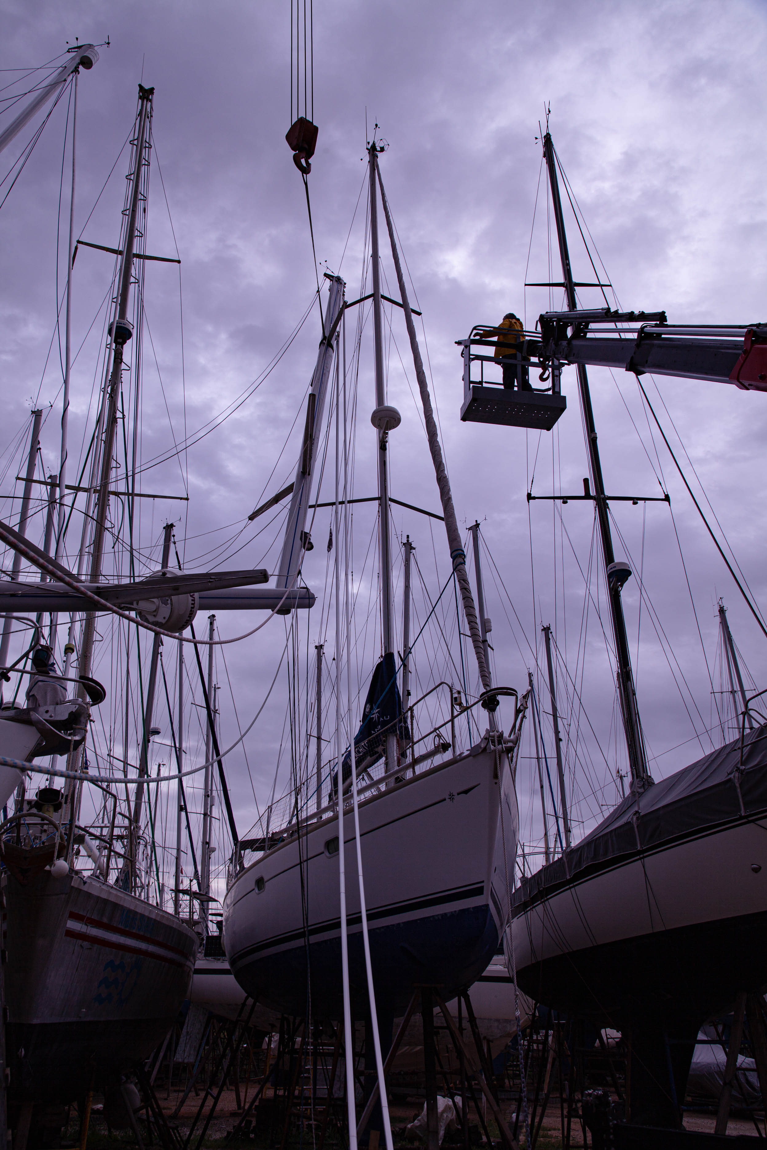 Samalla viivästyivät maston sähkö- ja elektroniikka-asennukset. Olin kylkikiinnityksessä koko lokakuun järjestellen mastoon, sähköihin ja metallitöihin liittyviä asennuksia. Kokemukseni on, että kaikissa näissä asennuksissa omistajan tulee olla paikalla, jotta kaikki maston heloituksen, läpivientien ja köysien asetukset ovat kohdillaan. Sama koskee kaapelointia, laiteasennuksia ja metallitöitä. Biminin ja aurinkopaneelien asentaminen jäi vielä huhtikuulle.
