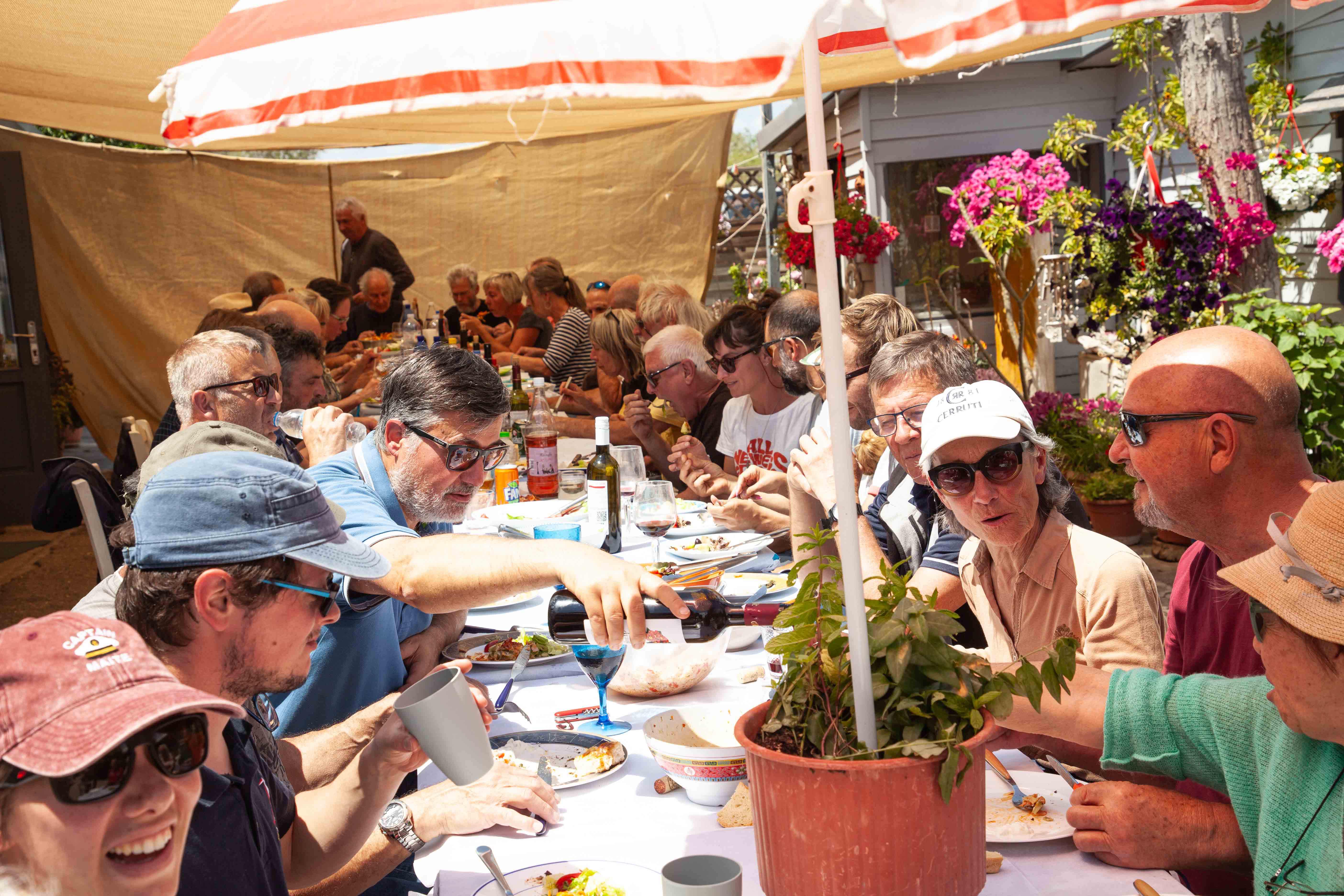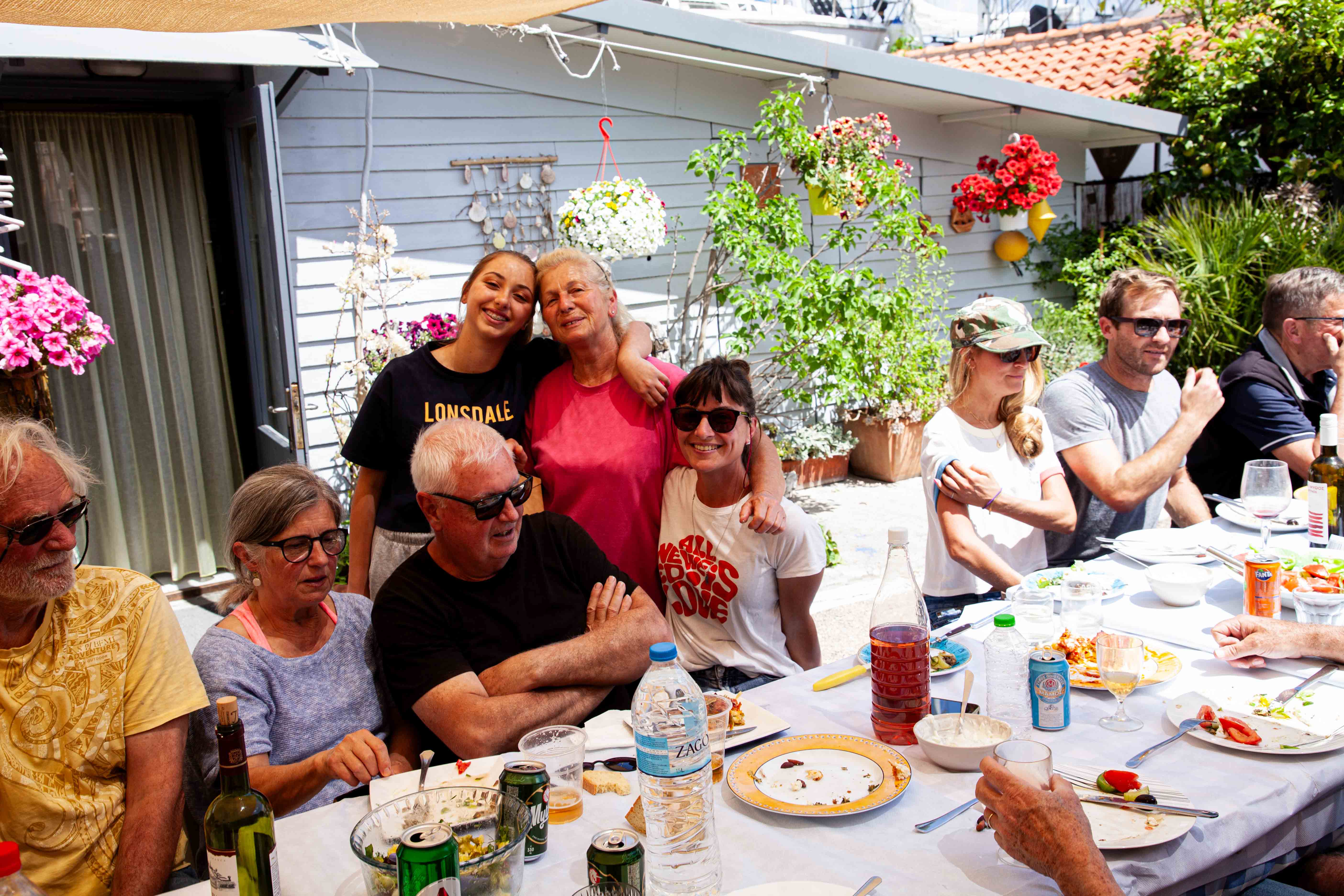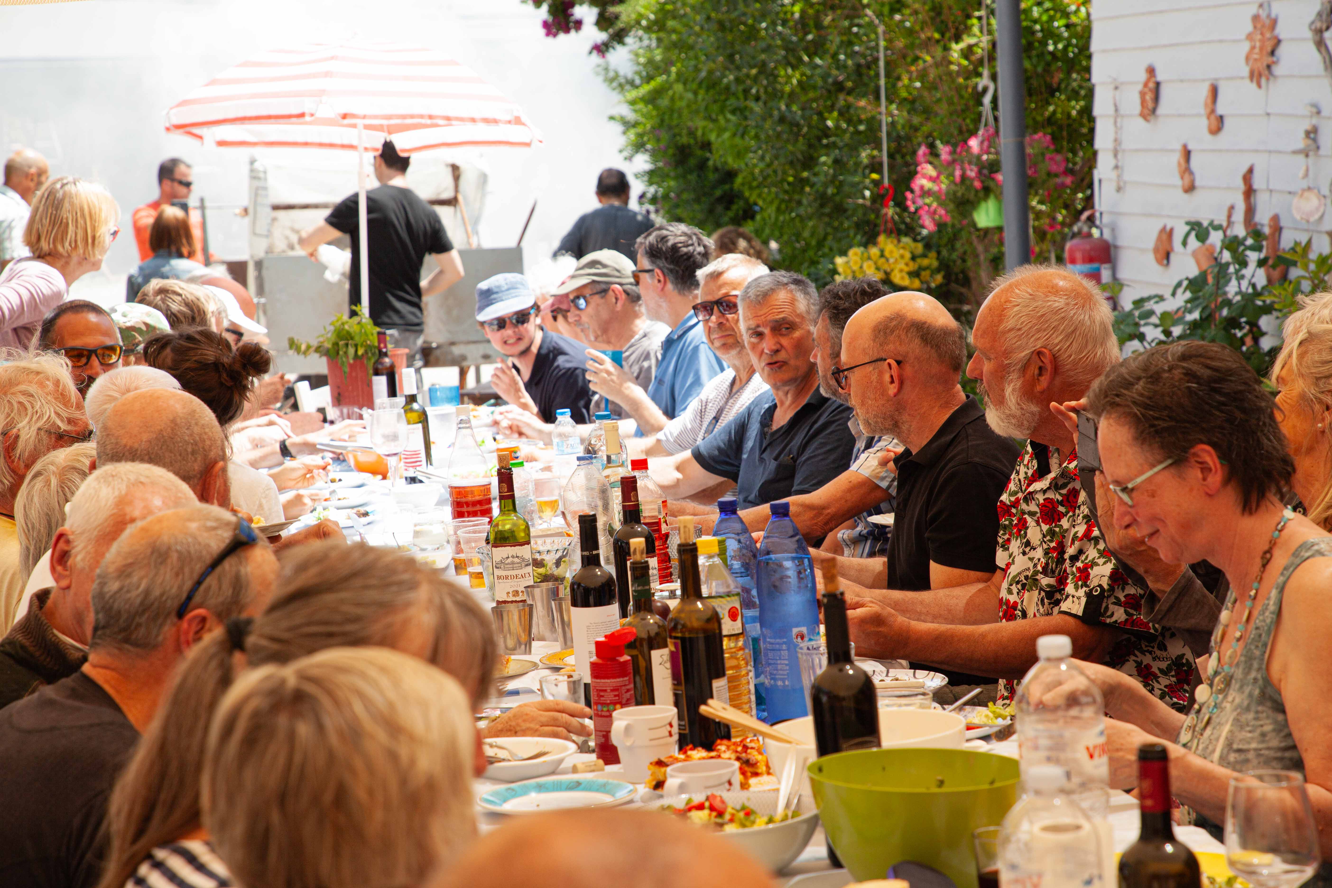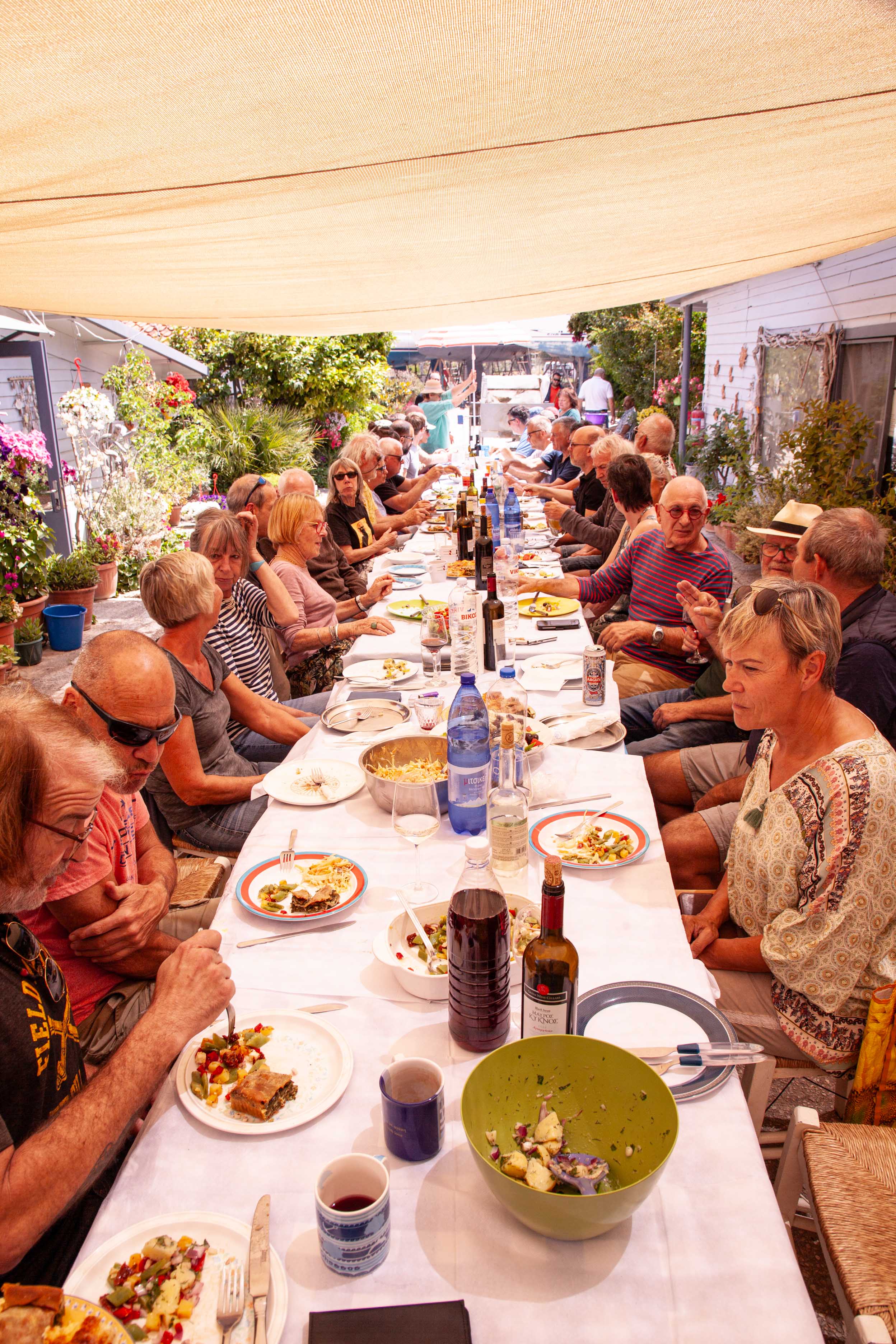 Puheensorina täyttää katoksen, ja jutut venyvät. Jälkiruuaksi saamme kakkua, kahvia ja suklaapaloja. Pöydät on katettu noin 50 henkilölle, mukana myös Petroksen perheen sukulaisia.