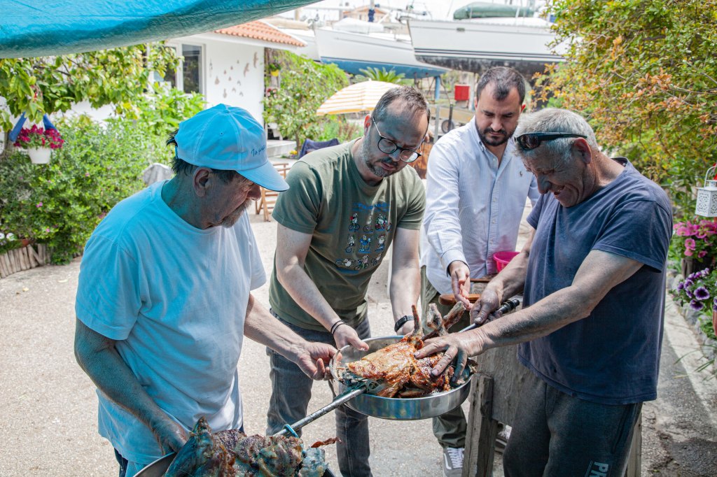 Kuva: Petros oikealla irrottaa pehmeäksi grillattua lapaa. Dimitrish keskellä ja tuttavat avustavat tulevaa tarjoilua.