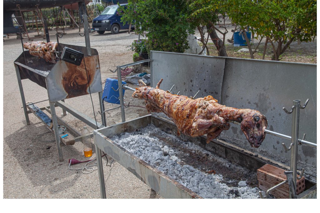 Sähkömoottorit pyörittävät lampaita iltapäivään, jolloin telakkaväki saa kutsun lounaalle. Tarjolla on alkupaloina kreikkalaisia lehtipiirakoita, värjättyjä munia ja vihreää salaattia. Petros miehineen irrottelee pehmeäksi kypsynyttä grillilihaa vartaista ja asettelee ne emalivateihin pöydälle.