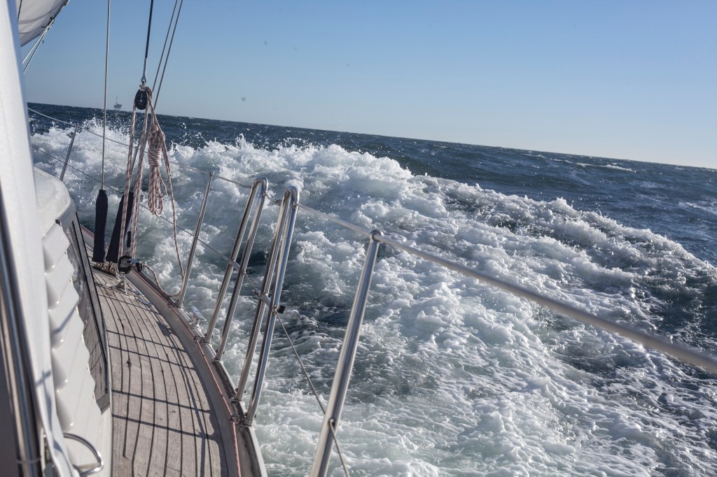 Ajatuksemme oli ensimmäisellä etapilla seilata reippaasti uusille vesille, ulos Itämeren altaasta. Siksi suuntasimme kohti Rotterdamia, koska olen jo vieraillut Alankomaiden sisämerellä ja sen kivoissa satamissa. Merivirrat ajoittivat lähtömme vasta iltapäivään. Otimme puolentoista tunnin varaslähdön, joka tuntui heti alkumaileilla. Merenselkä on Quxhavenin edustalla matala. Seitsemän metrin vastatuuli, matala vesi ja tuulenvastainen virta ovat pirullinen yhdistelmä. Aallon harjoja; pudotuksia ja taas harjoja ja pudotuksia. 10-metrinen vastatuuli on jo kovemmissa vastavirtapaikoissa liikaa. Mutta, kuten monesti ennenkin, ajo muuttui nautinnoksi, kun rannat olivat silmien kantaman tuolla puolen. Avotuuli, hyvä veto ja alla myötävirta. Matka taittui keskimäärin 10-solmun GPS-lukemilla (virta 2,5 solmua).