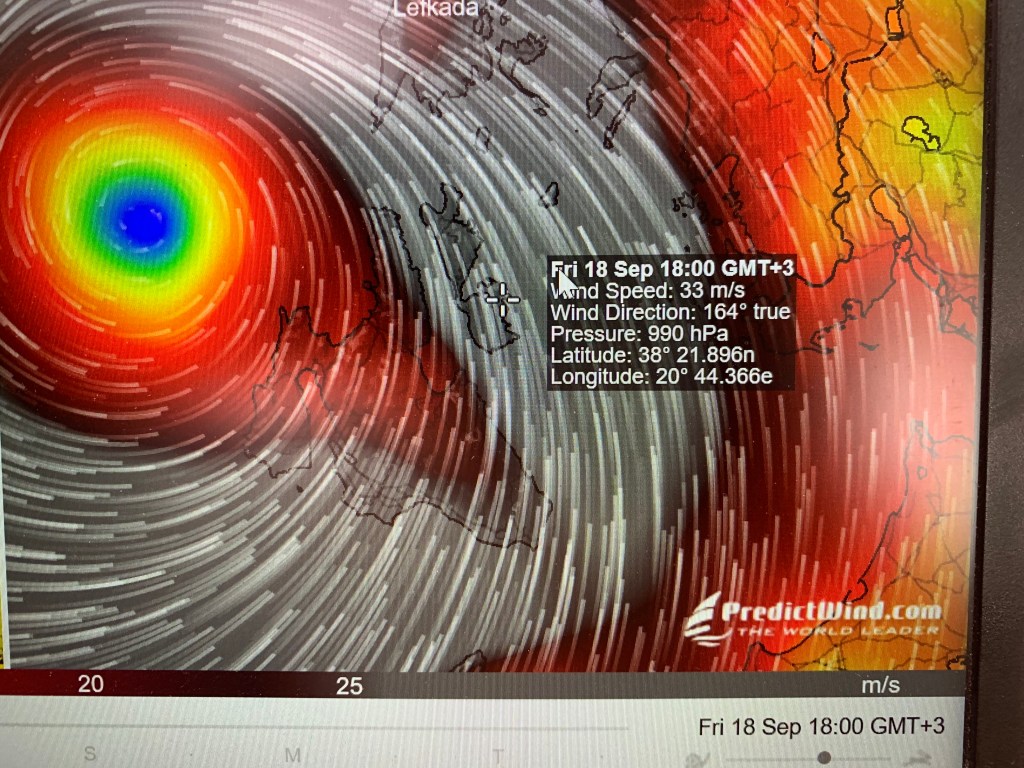 Soolopurjehdukseni jälkeen, syyskuussa 2020 vietin rentoja päiviä Joonian meren saaristossa. Havahduin Ithacalla, Odysseuksen saarella kuitenkin outoon sääennustukseen. Läntisellä Välimerellä kehittyi pyörteinen matalapaine, joka vahvistui päivä päivältä. Pyörre näytti suuntaavan kohti Kreikan länsiosaa, Kefaloniaa jonka liepeillä istuin Astrean kannella. Tuulikartan punaiset värit muuttuivat mustiksi pyörteiksi. Samoihin aikoihin Radio Olympia (VHF) varoitti poikkeuksellisen kovasta myrskystä eli medicanesta, joka lähestyi Joonian merta parin päivän kuluessa. Siinä missä Atlantin hurrikaanit etenevät idästä länteen, medicanet nousevat Välimerellä lännestä itään. Niin todella, tuo pyörteinen säärintama oli medicane, Ianos nimeltään, joka luokiteltiin maailman mitassa I-tason pyörremyrskyksi. Vuoden 2020 kesä oli poikkeuksellisen lämmin, mikä puolestaan nosti meren lämpötilaa parhaimmillaan 27 asteeseen.